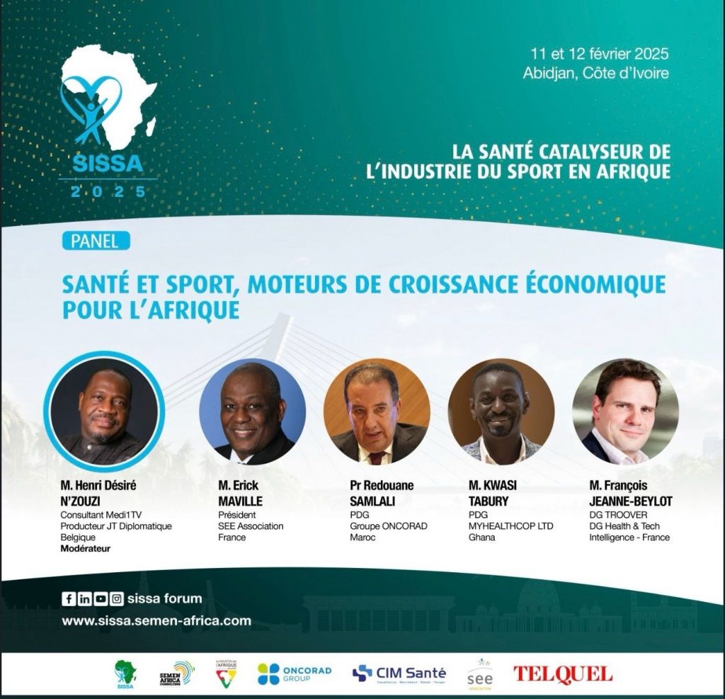 SEE Association, partenaire du 1er Sommet sur les Investissements dans les Systèmes de Santé en Afrique (SISSA), les 11 et 12 février derniers à Abidjan, organisé sous Le Haut Patronage du Ministère de la Santé, de l’Hygiène Publique et de la Couverture Maladie Universelle (Côte d’Ivoire), par SEMEN AFRICA CONSULTING sur le thème « La santé, catalyseur de l’industrie du Sport en Afrique »